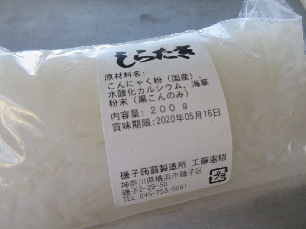 このしらたきは、磯子区で製造されたもの。ちなみに、コマデリで使う豆腐や厚揚げはいつも高橋豆腐店さんで仕入れています。