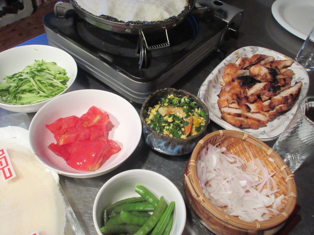 ある日の夕食は、春餅。皮から作るつもりでいたけれど、春巻の皮があったので、代用してみました。皮は軽く炙りながら、地元の新鮮野菜をたっぷりと挟んで。口に広がる野菜のみずみずしさがたまりませんでした。まさに口福♪ これから暑い日にぴったりなメニューです。