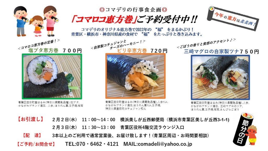 「コマロコ恵方巻」ご予約受付中!! 作成者:htmaoba 10 1月 202219 1月 2022 コマデリのオリジナル恵方巻で2022年の “福” をまるかぶり! コマデリの行事食企画「コマロコ恵方巻」のご予約受付中です。 ご利用お待ちしております♪ 共有: X で共有 (新しいウィンドウで開きます) X Facebook で共有 (新しいウィンドウで開きます) Facebook いいね 読み込み中… 関連