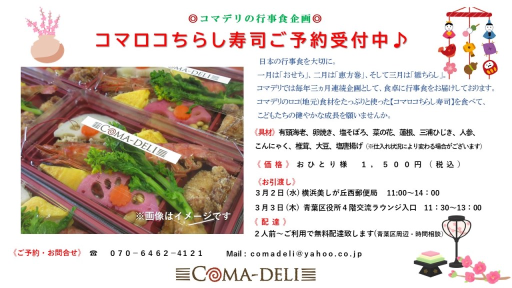 1月は「おせち」、2月は「恵方巻」、そして3月は「雛ちらし」。コマデリは毎年3ヵ月連続で行事食を食卓にお届けしております。