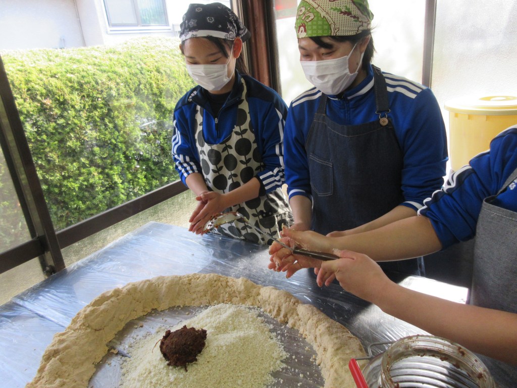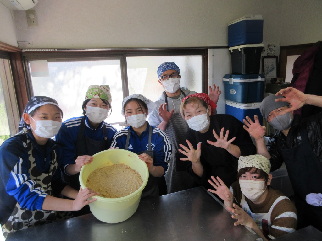 今回もしっかり、卒業する先輩が昨年仕込んでくれた味噌を種味噌に加えて伝統をつなげました。↓手を合わせているところが何とも可愛い。