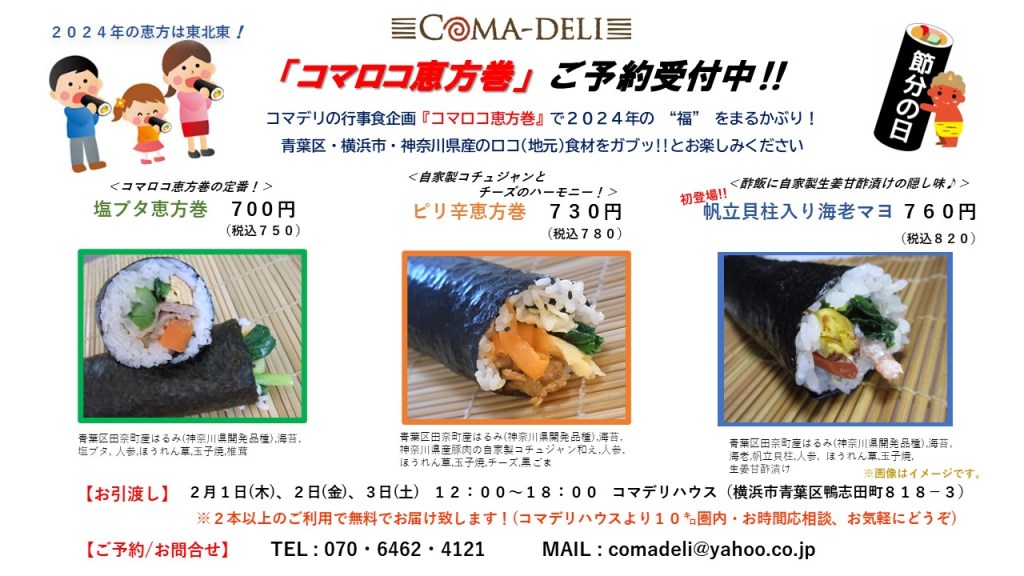 青葉区・横浜市・神奈川県産の食材をたっぷりと巻き込む「コマロコ恵方巻」のご予約受付中です。