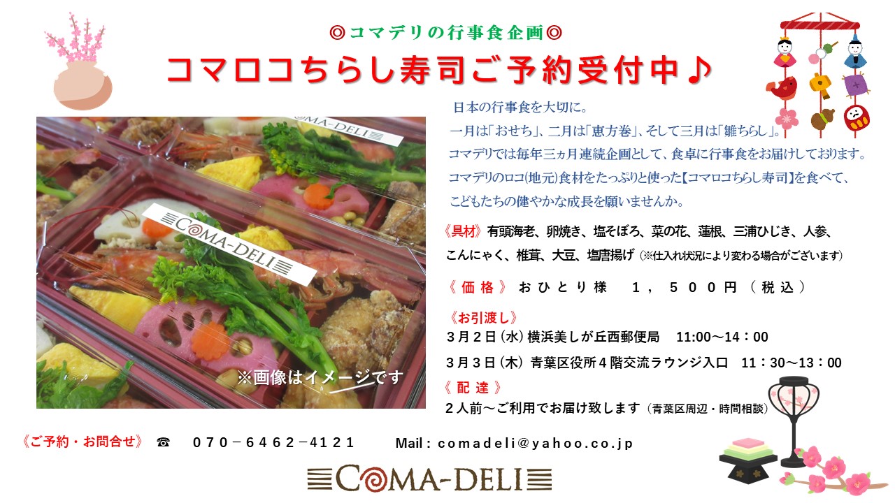日本の行事食を大切に。 1月は「おせち」、2月は「恵方巻」、そして3月は「雛ちらし」。コマデリは毎年3ヵ月連続 … “「コマロコちらし寿司」ご予約受付中♪” の続きを読む
